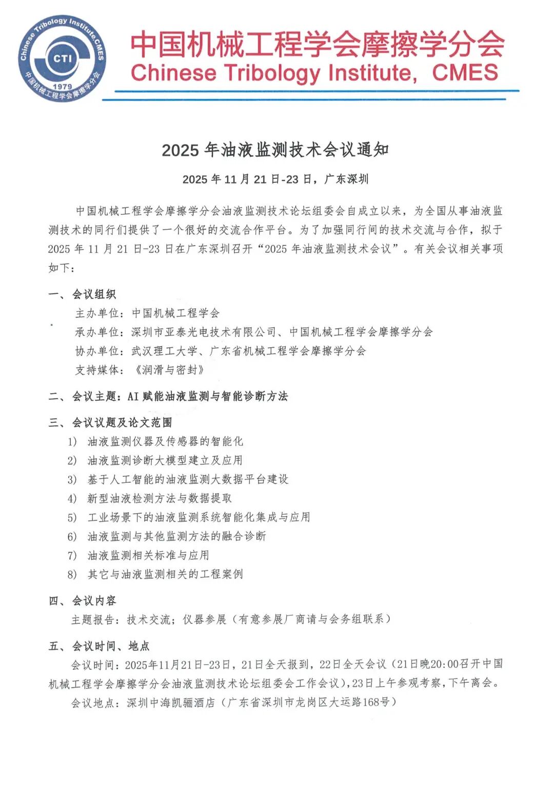 “2025年油液監(jiān)測技術會議”將于2025年11月21日-23日在廣東·深圳中海凱驪大酒店隆重召開 。本次大會由中國機械工程學會主辦,深圳市亞泰光電技術有限公司與中國機械工程學會摩擦學分會共同承辦,將以“AI賦能油液監(jiān)測與智能診斷方法”為主題,攜手業(yè)界精英,共繪智能運維的新藍圖。